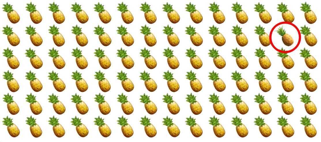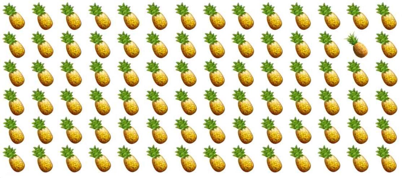 Løs et enkelt, men meget vanskeligt puslespil – du skal finde en særlig ananas, som er forskellig fra alle dem, du ser på billedet.