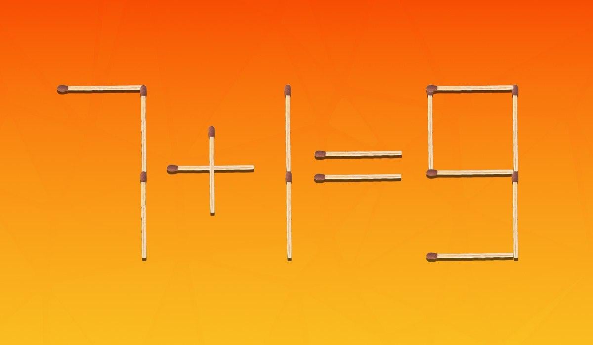 Nedenfor kan du se et billede, hvor ligningen 7+1=9 er opstillet med tændstikker. Det er naturligvis matematisk ukorrekt, og du skal rette det ved kun at flytte to tændstikker ud af 15.