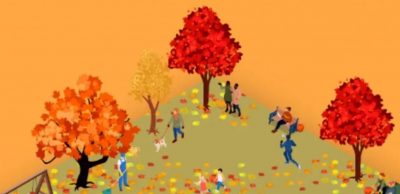 Billedet viser en efterårslegeplads, hvor folk og børn går rundt. Alle har travlt med at lave deres egne ting, men ved siden af nogle af dem ligger de græskar, vi leder efter.