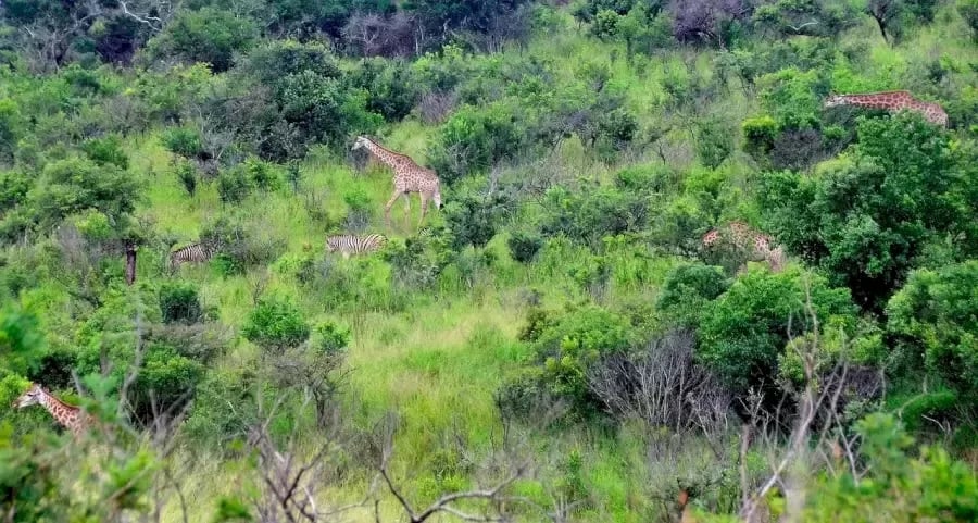 Vi ser en gruppe dyr vandre rundt mellem grønne træer og buske. Der er et vist antal giraffer og zebraer på billedet. Men det er ikke let at tælle det nøjagtige antal. Når alt kommer til alt, er nogle af dyrene tydeligt synlige, men samtidig kan nogle af dem være skjult for vores øjne.