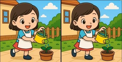Så er du klar til den næste udfordring? Se nøje på de to billeder af en pige, der vander en plante. De ser måske ens ud ved første øjekast, men der er 3 små forskelle. Tror du, at du kan finde dem alle på 59 sekunder? Prøv det, og test din synsstyrke!