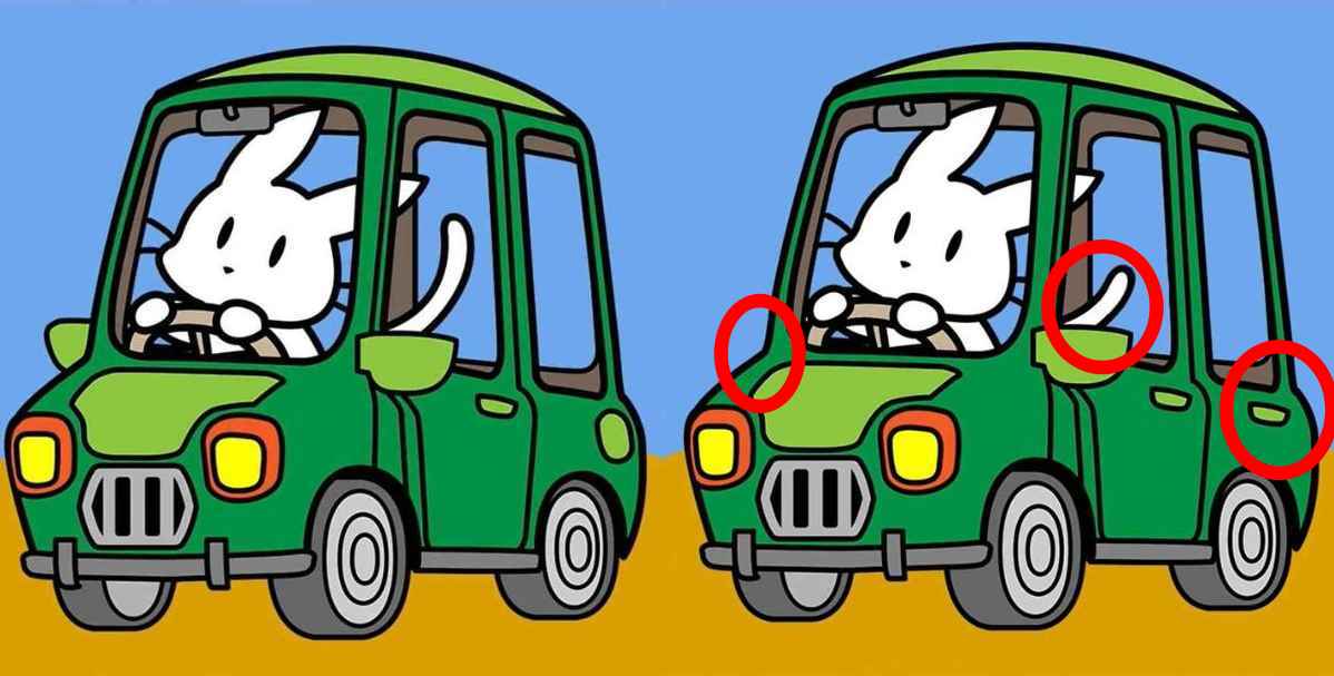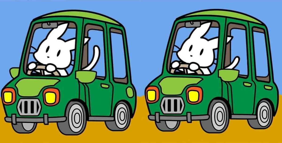 Prøv at løse et sjovt, men ikke det nemmeste puslespil – du skal finde flere forskelle i to billeder, der viser en kanin, der kører bil.