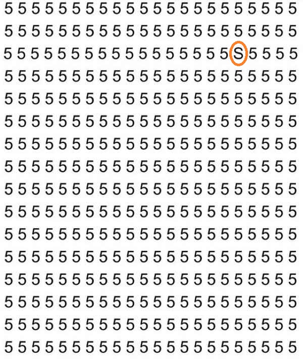 På billedet ser vi en masse cifre 5, som er arrangeret i rækker og kolonner. Hvis man ser på dette billede, kan det i de første sekunder se ud, som om der bestemt ikke er noget bogstav S nogen steder. Men dette første indtryk skal man ikke stole på – det er der helt sikkert, det er bare ikke så let at lægge mærke til det.